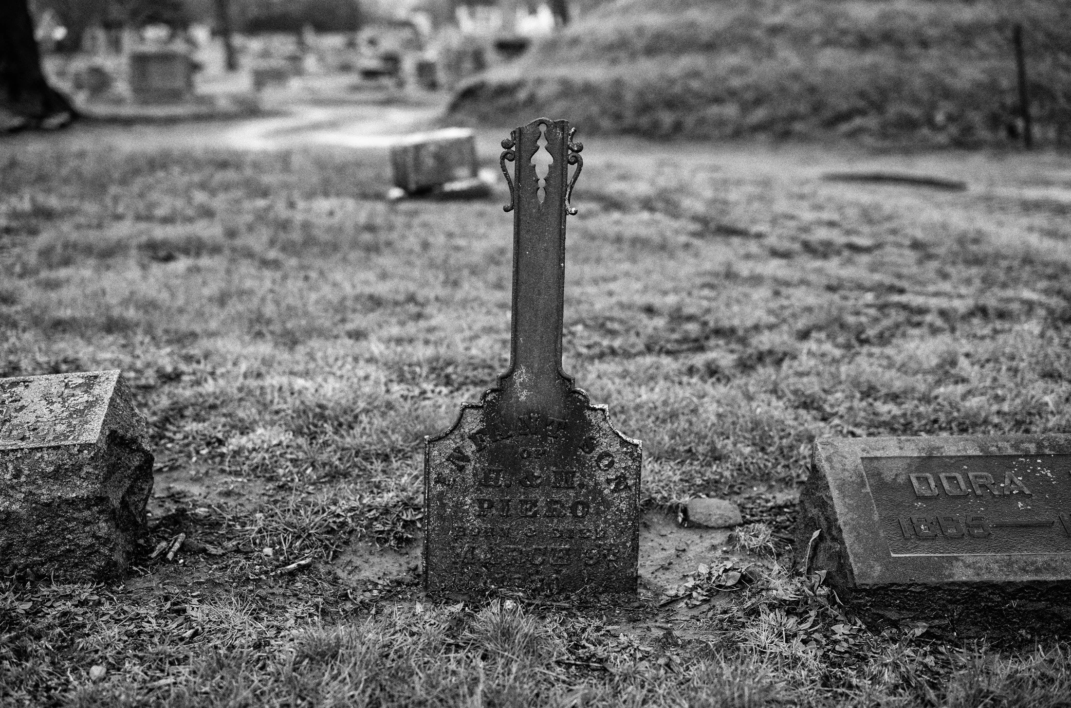 In photography, we often look for the "perfect" subject, but there is an undeniable beauty in the imperfect. The shattered porcelain and the small, cracked heart-shaped stone resting on the steps tell a story of a visit made, a tribute left, and the slow, inevitable wear of time. It’s a stark contrast to the iron-sharp lines of the Piero family marker or the stoic endurance of John Price.