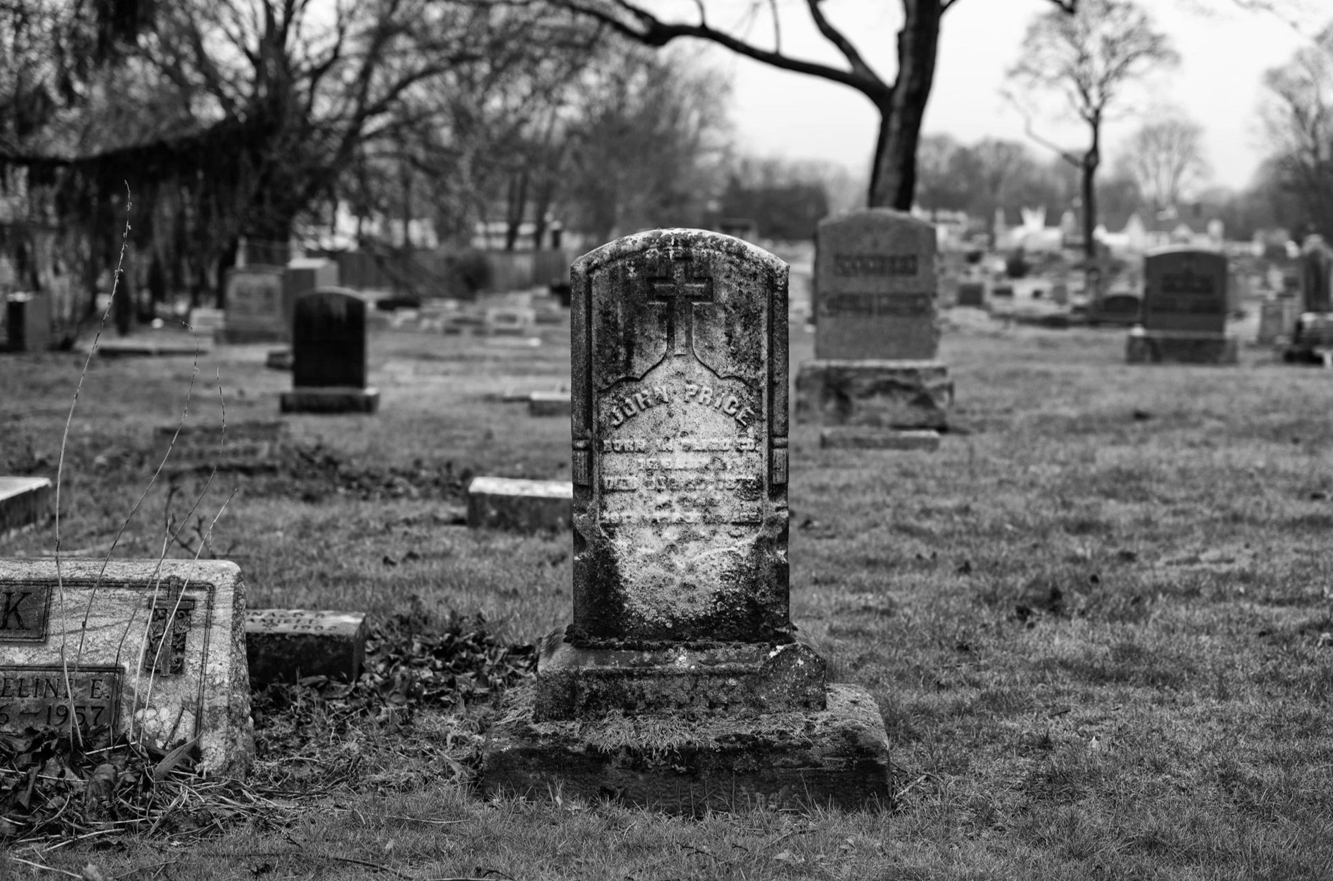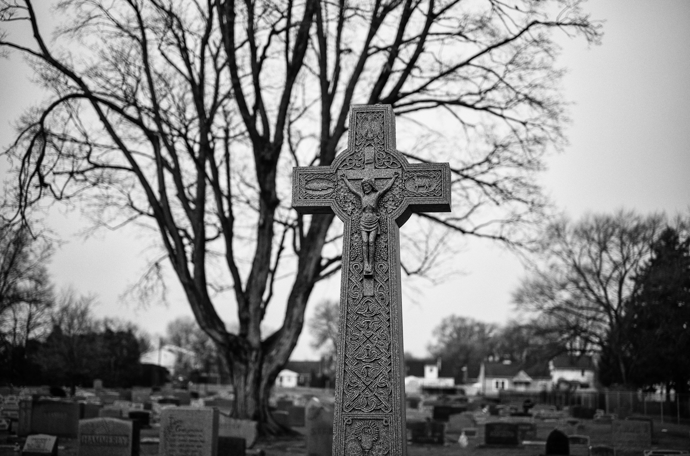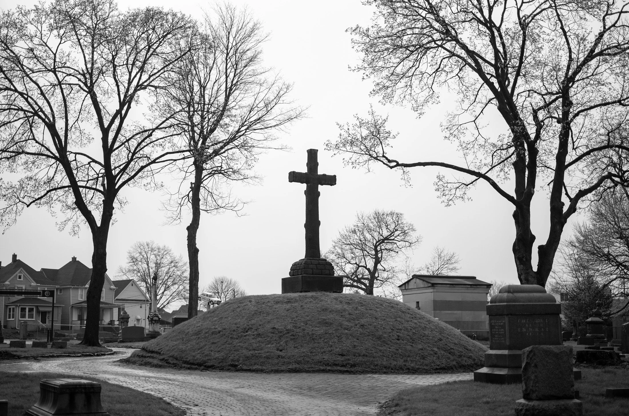 A black and white landscape of the central crucifix mound at St. John’s Cemetery in Canton, Ohio, captured with a Leica 50mm APO.